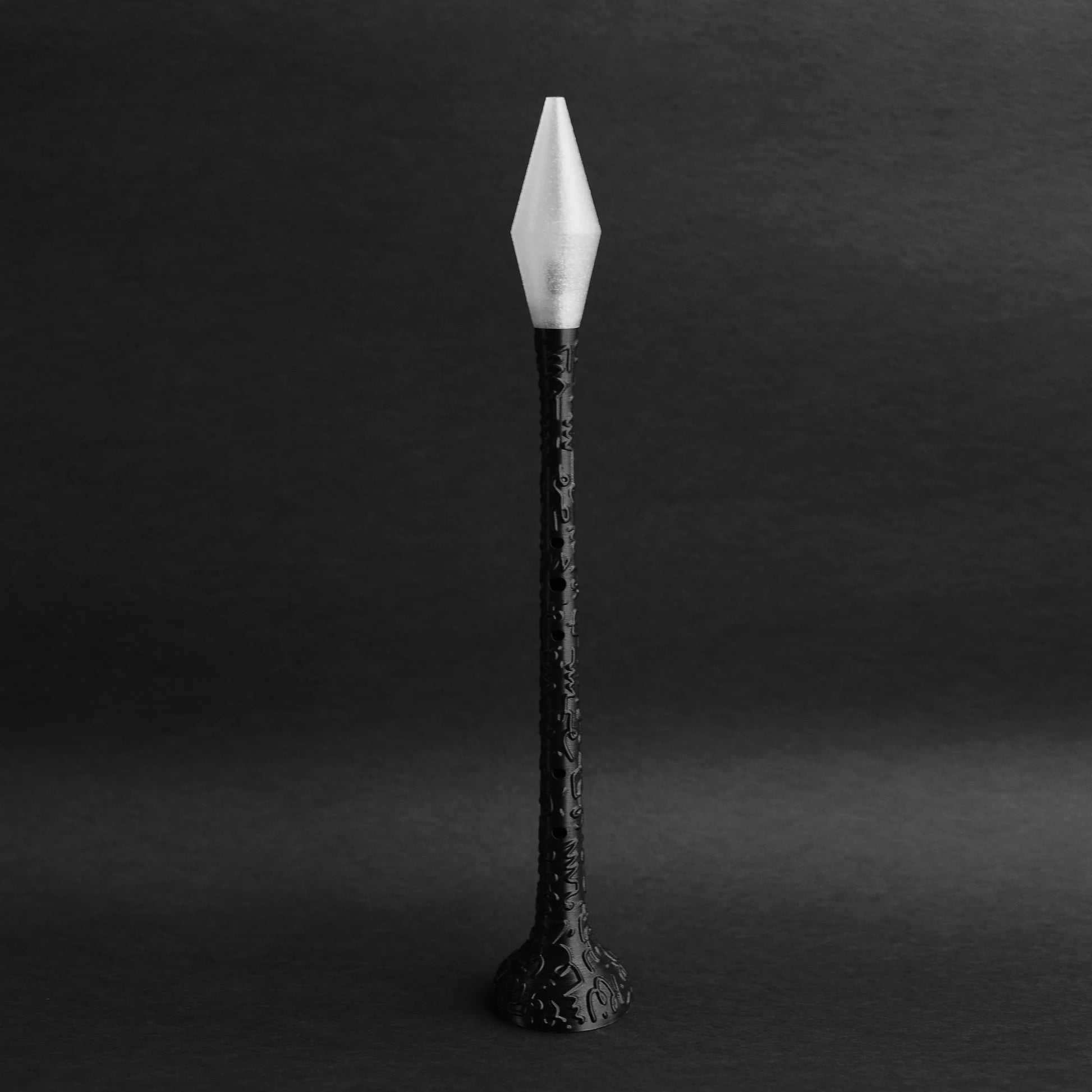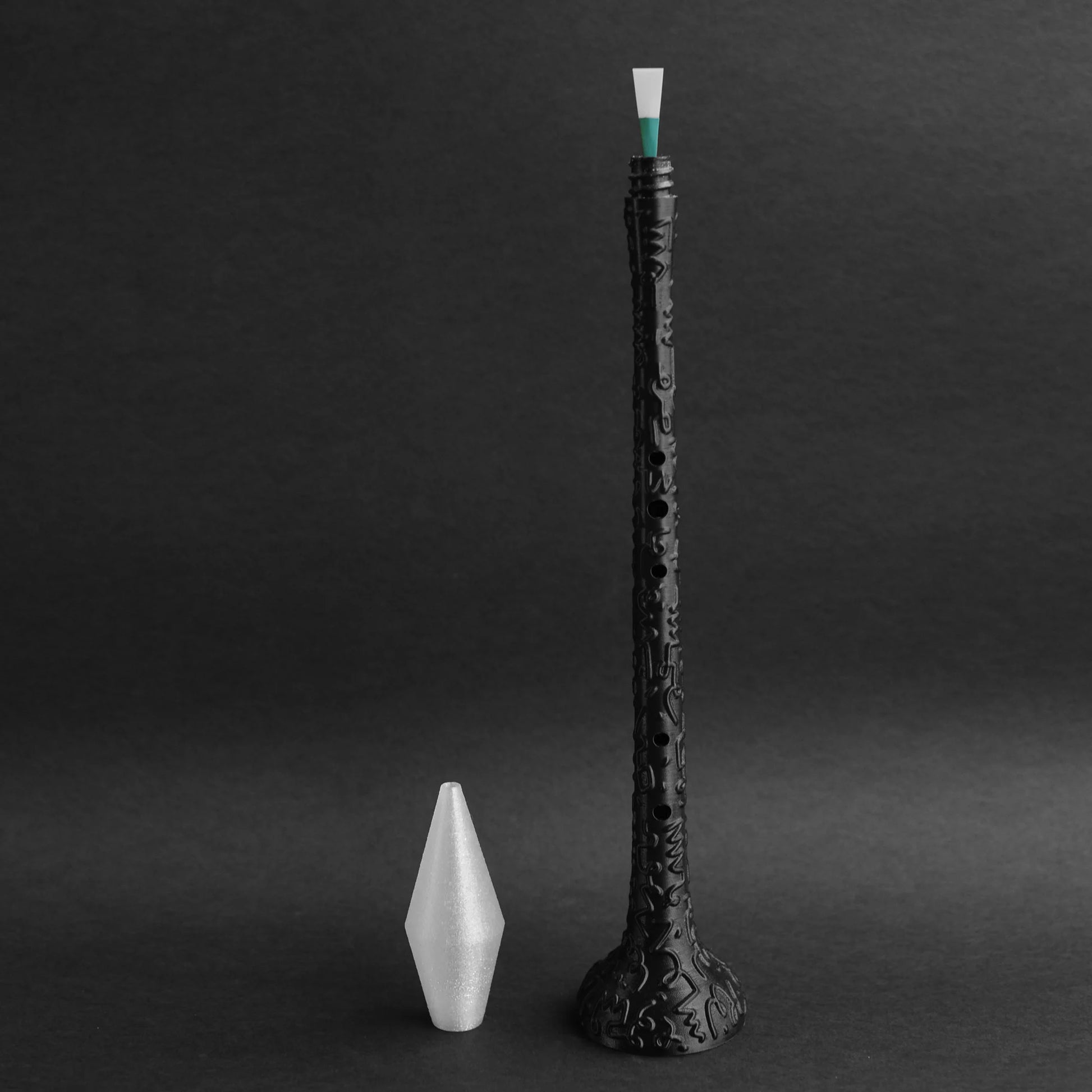 Scarface pipe in black. Based on a chanter, it comes with a plastic bagpipe chanter reed, handmade in the UK. The reed can be changed and is not glued to the pipe. It has a threaded top for extra air tightness! The top is kind of transparent so you can see the reed. The bastard is about 42 cm long.