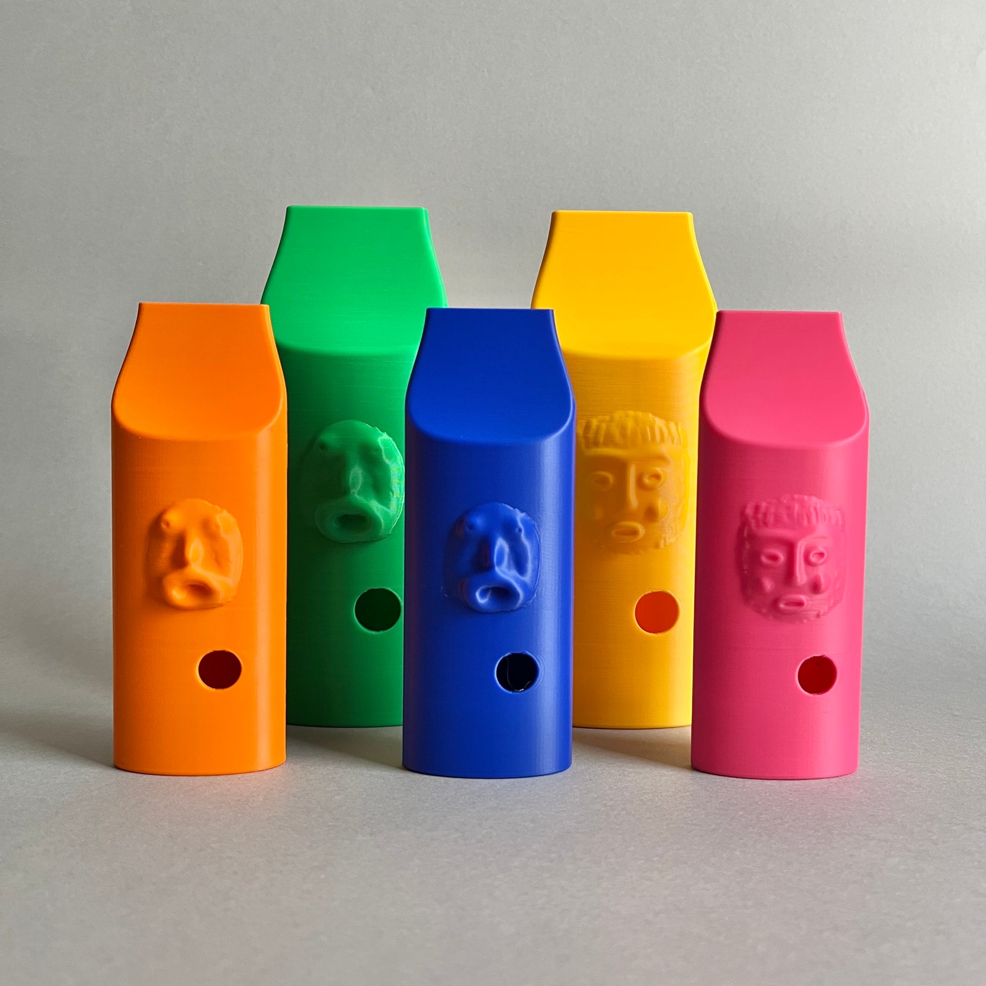 These non-traditional ocarinas are strange microtonal beauties. 5 of them make a true bastrad family of two headed beasts. Also playable by small hands of little people. Height of the instrument is bastard is approx 12cm. Hight of Big Bastard is approx 15.5cm 3D printed in biodegradable PLA in our London studio.